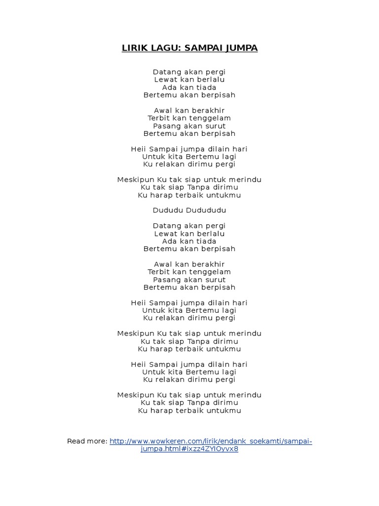 Ku ingin bercerita tentang kisahku dulu yang telah ku jalani semua waktu ku bersamanya awalnya bahagia dan sesuai rencana hingga akhirnya datang orang ketiga ku coba untuk. Lirik Sampai Jumpa dari Endank Soekamti ini dipublikasikan pada tanggal 2 Februari 2016 6 tahun yang laluLagu ini ada di dalam album Soekamti Day yang didistribusikan oleh label Euforia Records. Pasang akan surut bertemu akan berpisah.