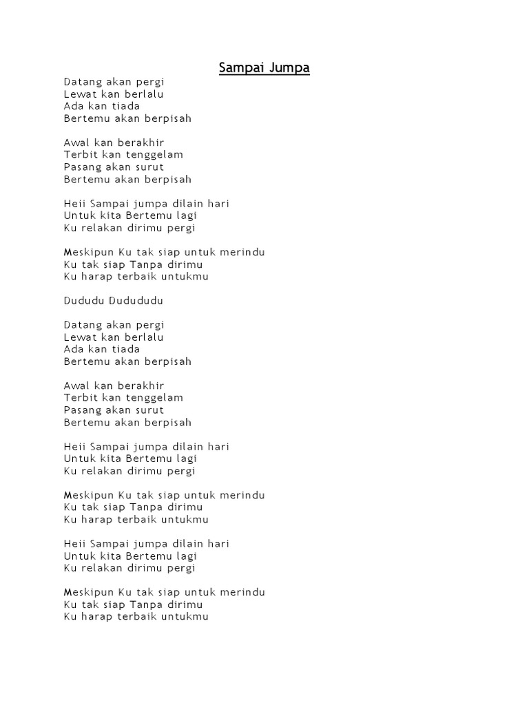 Untuk kita bertemu lagi ku relakan dirimu pergi. Andaikan ku terima cinta suciku. Lirik lengkap lagu Sampai Jumpa yang dinyanyikan awak kapal KRI Nanggala 402.